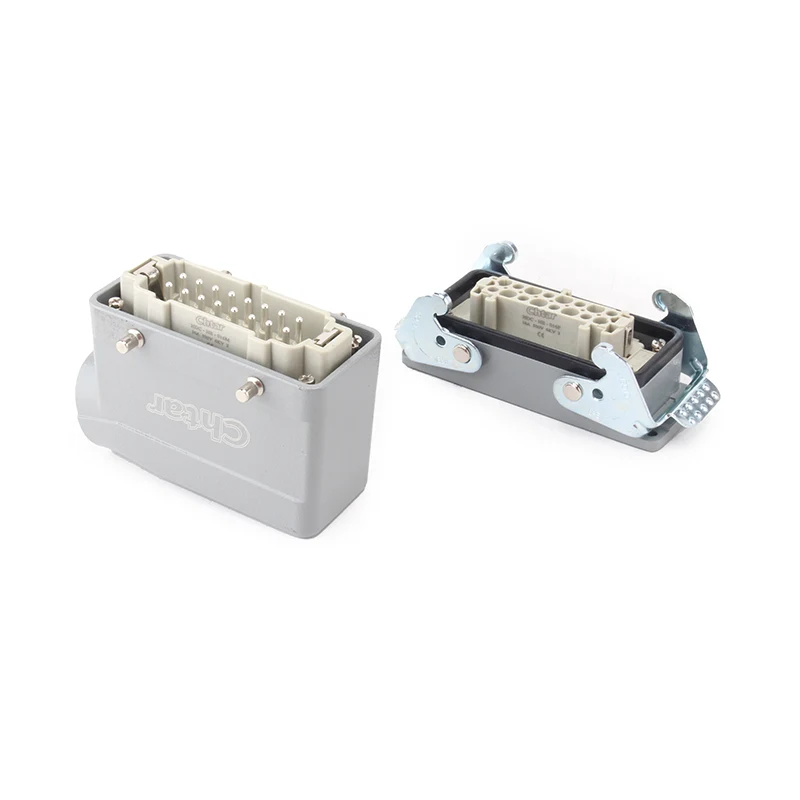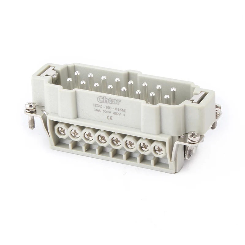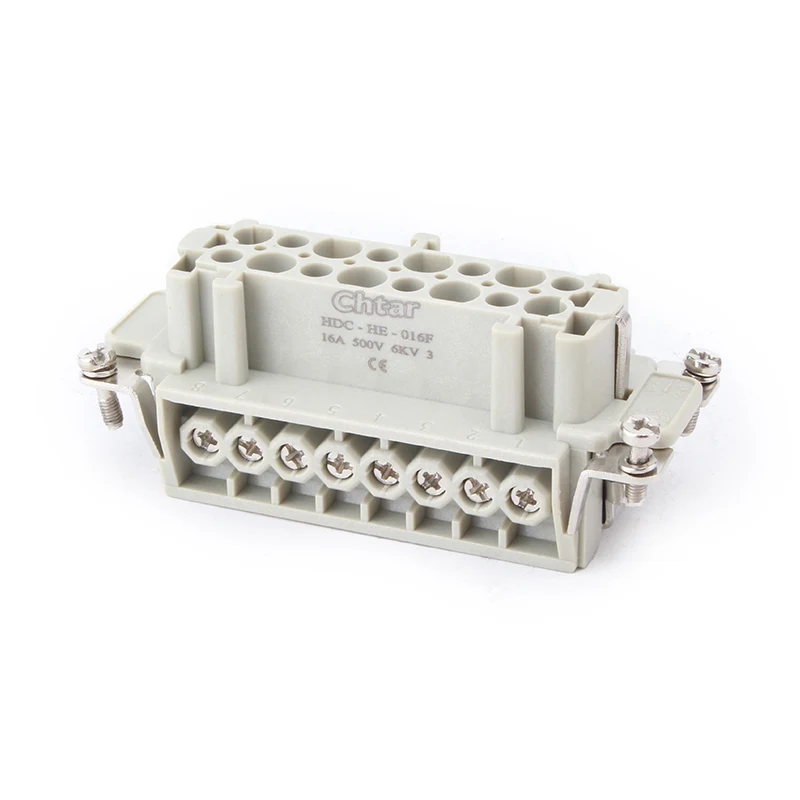 CHTAR ၏အဆင့်မြင့် 16A HE-016-F/M plug-in အကြီးစားချိတ်ဆက်ကိရိယာသည် M/F 16 Pin Insert Heavy Duty Connector ဖြစ်သည်။ ၎င်းတွင် အမျိုးသားနှင့် အမျိုးသမီး အစိတ်အပိုင်းများ ပါရှိသည်။ ၎င်းသည် H16B shell heavy-duty connector နှင့် တွဲဖက်အသုံးပြုနိုင်သည်။ အများအားဖြင့်၊ အထီးအစိတ်အပိုင်းကို အမျိုးသားအိမ်များတွင် စုဝေးကြပြီး သို့မဟုတ် ဖောက်သည်လိုအပ်ချက်အရ ပြောင်းပြန်တပ်ဆင်ရန်အတွက် အမျိုးသမီးအစိတ်အပိုင်းတွင် တပ်ဆင်နိုင်သည်။ ခိုင်ခံ့သော PC casing ပစ္စည်းနှင့် ငွေရောင်ချထားသော ကြေးဝါချောင်းများသည် M/F 16 pin plug-in အကြီးစားချိတ်ဆက်ကိရိယာ၏ လျှပ်ကူးမှုနှင့် လုပ်ငန်းလည်ပတ်မှုဆိုင်ရာ အားသာချက်များကို သေချာစေသည်။